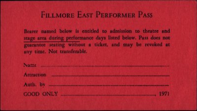 Here is performer pass. Courtesy: Jack Weston Original Fillmore East ephemera for sale - email jweston@mn.rr.com