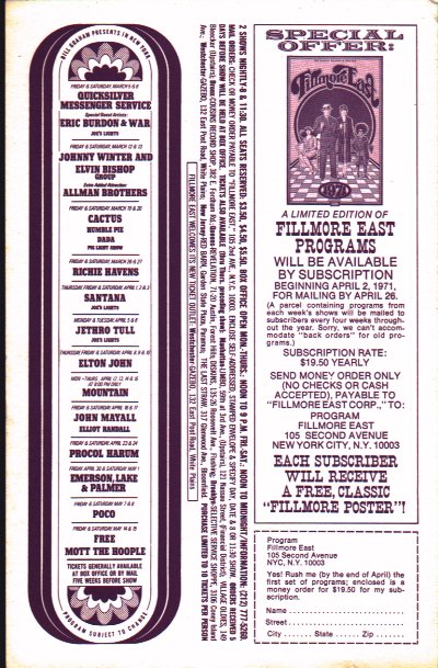 Original Fillmore East ephemera for sale - email jweston@mn.rr.com |